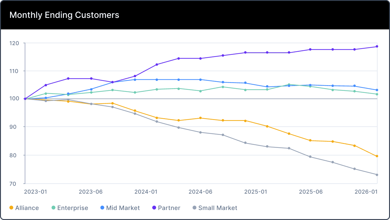 Segment ARR and customer trends by product, cohort, business unit, or any dimension your board needs. Visualize MoM movements in trends view. Share a board-ready view without rebuilding it from scratch each time.